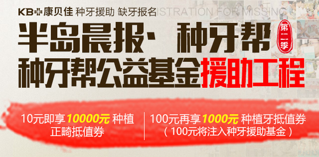 100元再享1000元种植牙抵值券(100元注入半岛晨报与康贝佳口腔的种牙援助基金) 我要优惠>>>